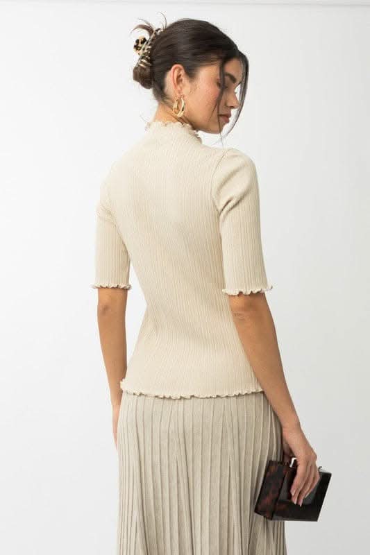 You’re going to love adding this feminine short sleeve mock neck top to your fall wardrobe! It features a merrow edge and can be layered on its own or with your favorite sweater. The versatile style is perfect for any occasion, whether you’re at the office, out on the town, or running errands. This is a must have item in every woman’s closet.