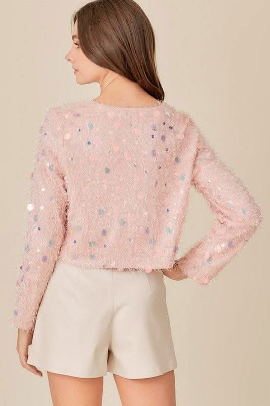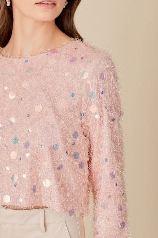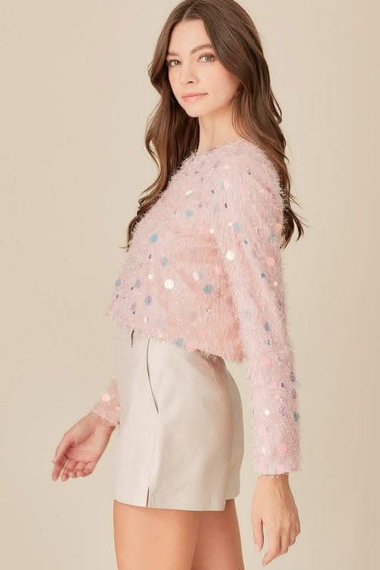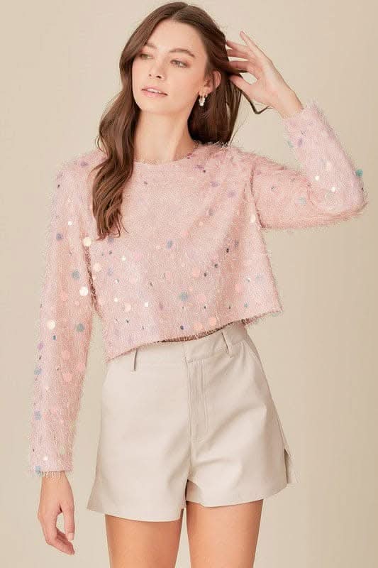 Add a touch of sparkle with this shimmer trim top! This flattering top features a crop length, long sleeve and round neckline. We love the fun and flirty style that can be worn over anything. Pair them with some vegan leather shorts, leggings or jeans for easy yet fashionable everyday wear or style with black trousers for extra special occasions.