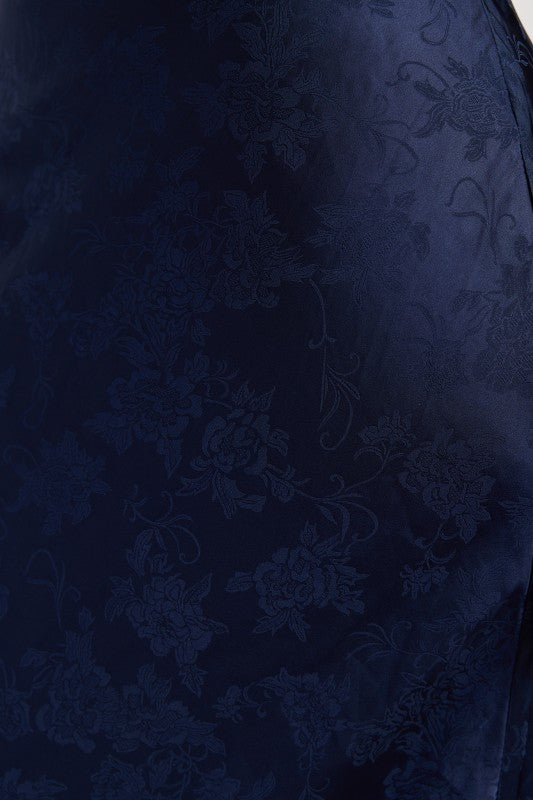 Embrace the allure of evening elegance with the After Dusk Open Back Maxi Dress. This stunning silhouette features a sleek navy satin fabrication adorned with subtle floral jacquard texture, creating a sophisticated interplay of light and shadow. The sleeveless design and cross strap halter neckline frame the shoulders beautifully, and the open back with adjustable self-tie closure becomes your statement moment. Perfect for those occasions when you want to feel both powerful and poised. Whether you're stepping into a special evening or celebrating your own radiance, this dress transforms the way you move through the world.