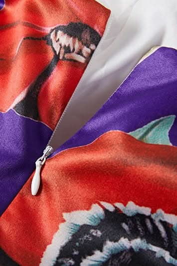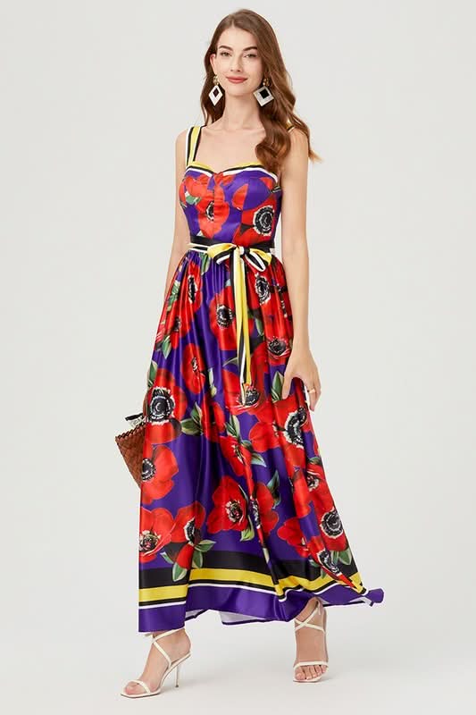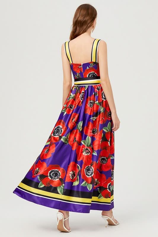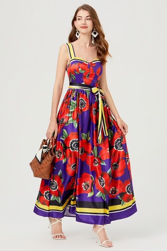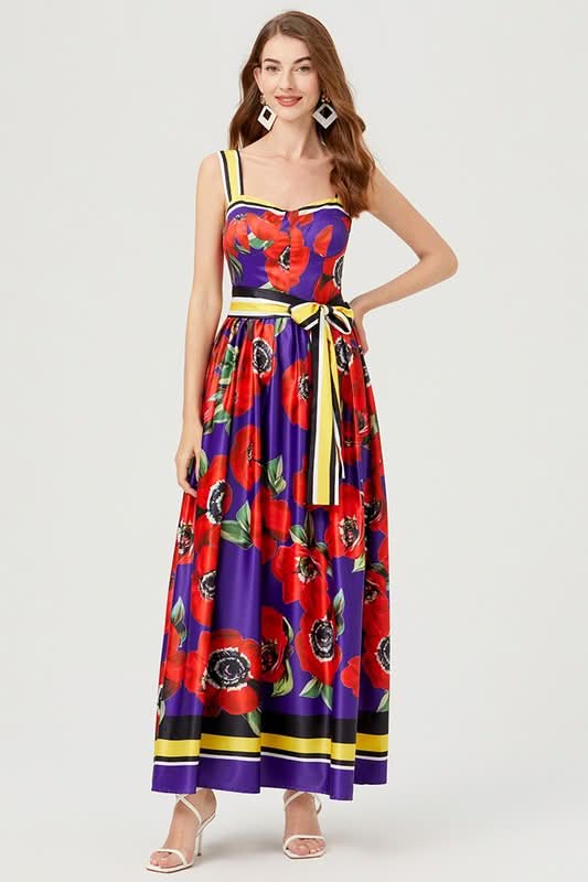 Bring on the bold. This striking floral maxi dress is here to turn heads—from beach boardwalks to candlelit dinners. With a vivid red poppy print blooming over rich violet, and contrast striped straps and belt, this piece radiates effortless elegance and joyful confidence. The sweetheart neckline and full gathered skirt move with grace, while the detachable sash ties it all together with a playful polish.