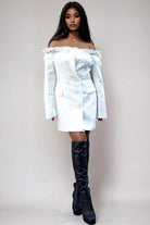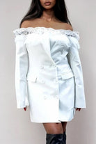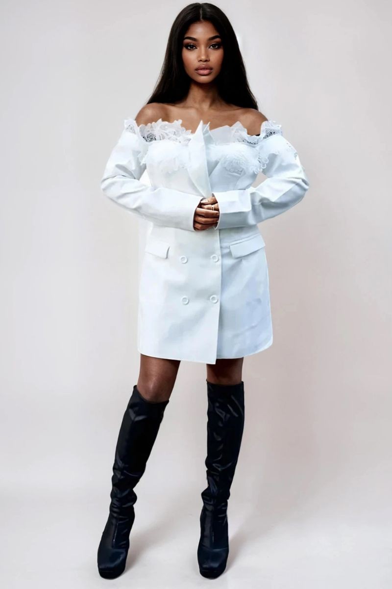 The Eva Lace Trim Blazer Dress brings a polished, feminine edge to any night out. Designed with a sculpted blazer silhouette and a soft off-shoulder neckline framed in delicate lace, it strikes the perfect balance between tailored structure and subtle romance. You’ll feel effortlessly put-together the moment you slip it on — elevated, secure, and ready for wherever the evening leads.