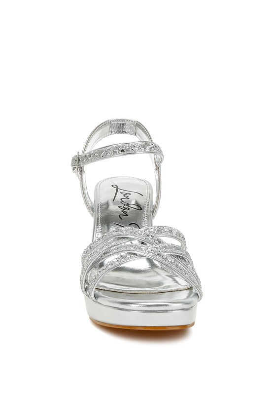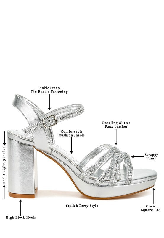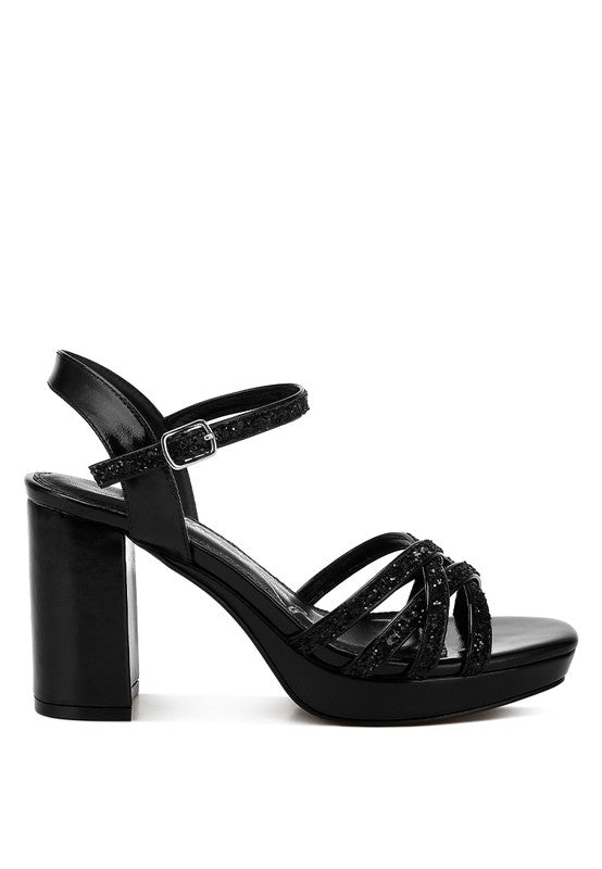 The Sparkle Strappy High Heel Sandals are dazzling and add a bit of flair with the tall block heels and glitter straps detail. These sandals will make a statement at any party or wedding with their glam and subtle maximalist vibe.
