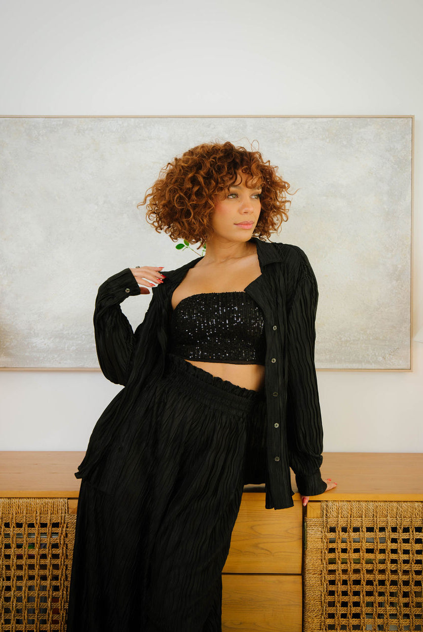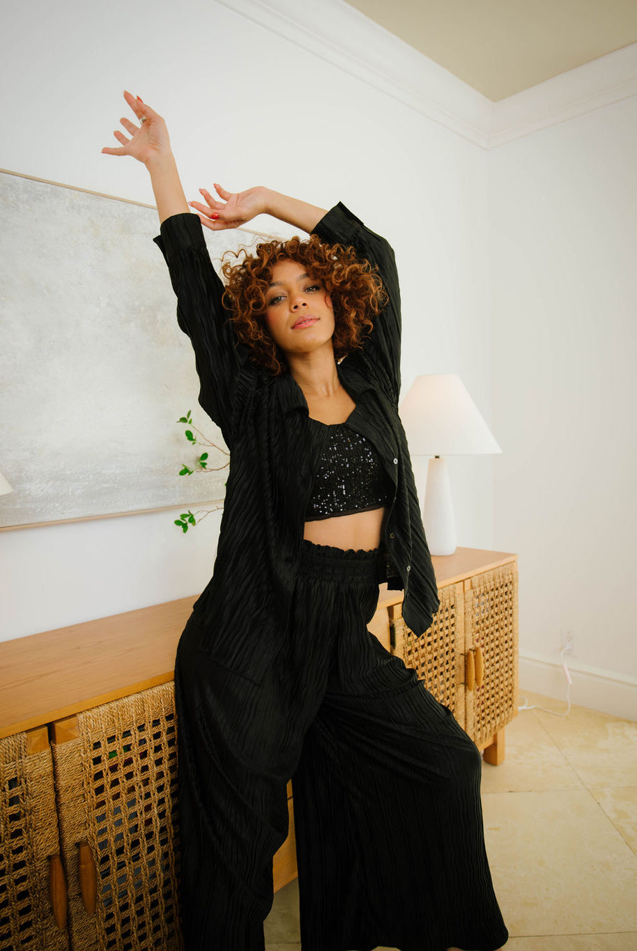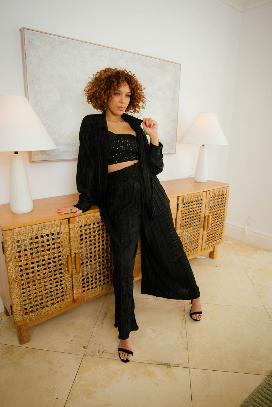 Experience the comfort and style of our Elegance Unfolded High Waisted Wide Leg Pants. These woven pants feature a high waist, pleated design, and an elastic waistband with ruffle trim, making them a perfect match for the Midnight Poise Pleated Shirt.