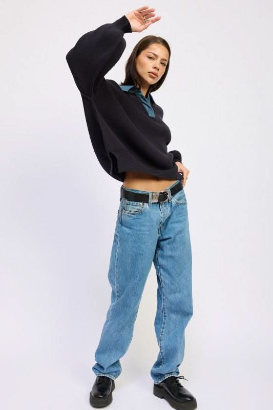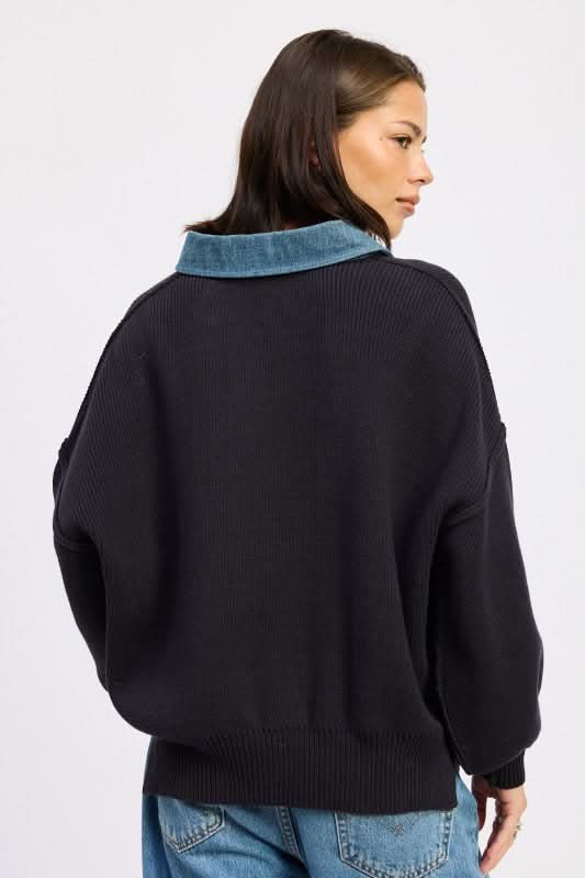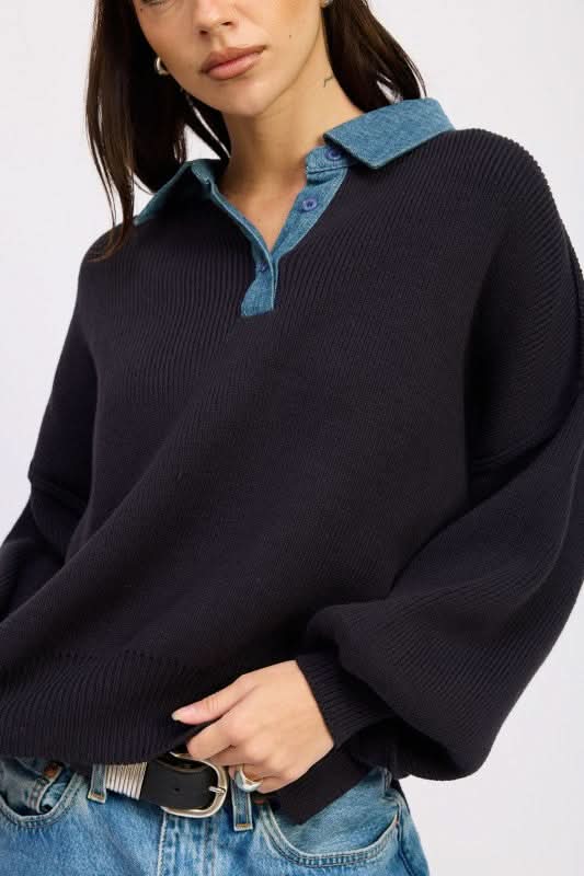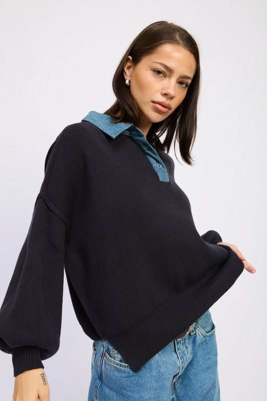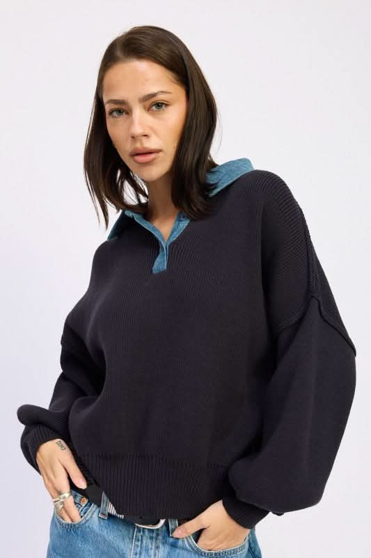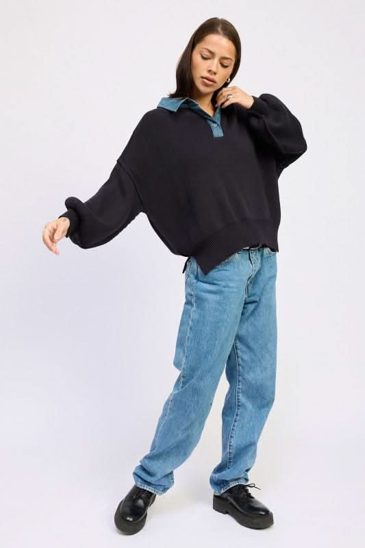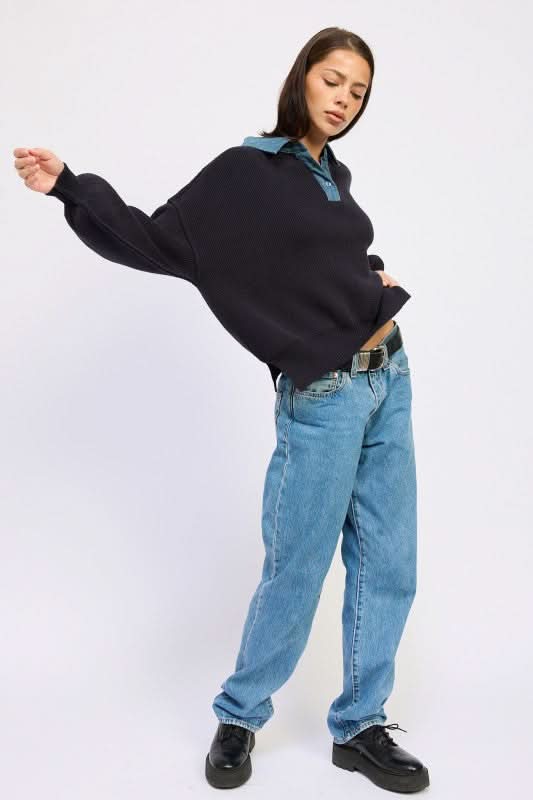 Elevate your casual wardrobe with the Ella Navy Oversized Collared Sweater, designed for a relaxed yet polished look. Featuring a stylish contrasting collar, it adds a subtle touch of sophistication to its roomy silhouette. Side slits enhance ease of movement and create a flattering drape, while the drop shoulder design emphasizes a laid-back, trendy vibe. Crafted in a rich navy hue, this sweater pairs effortlessly with jeans or skirts for versatile chic appeal. Perfect for layering, it offers comfort without sacrificing on style.