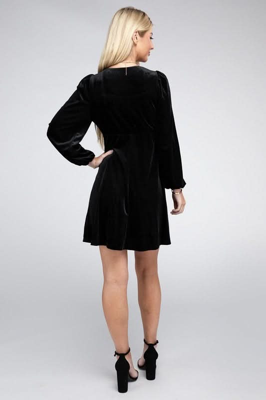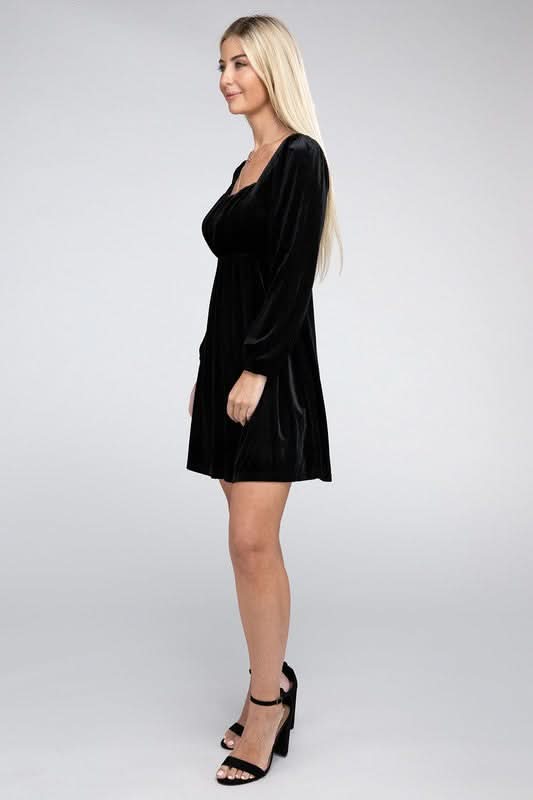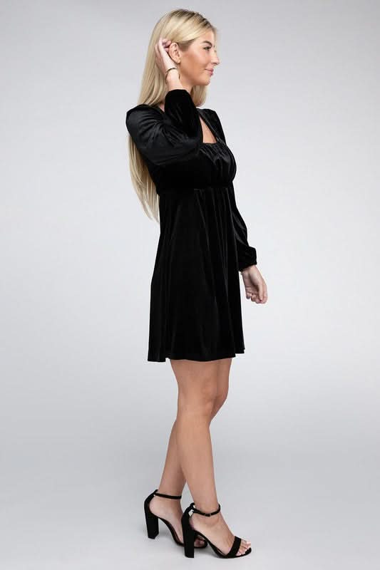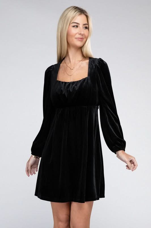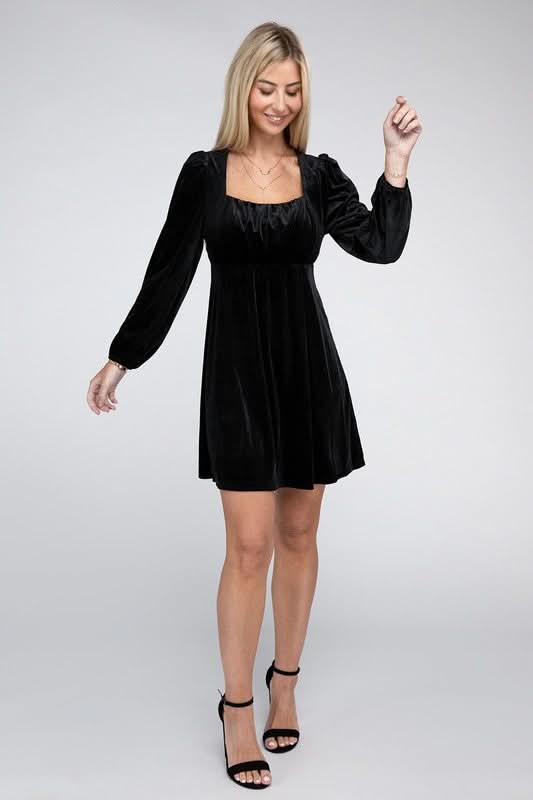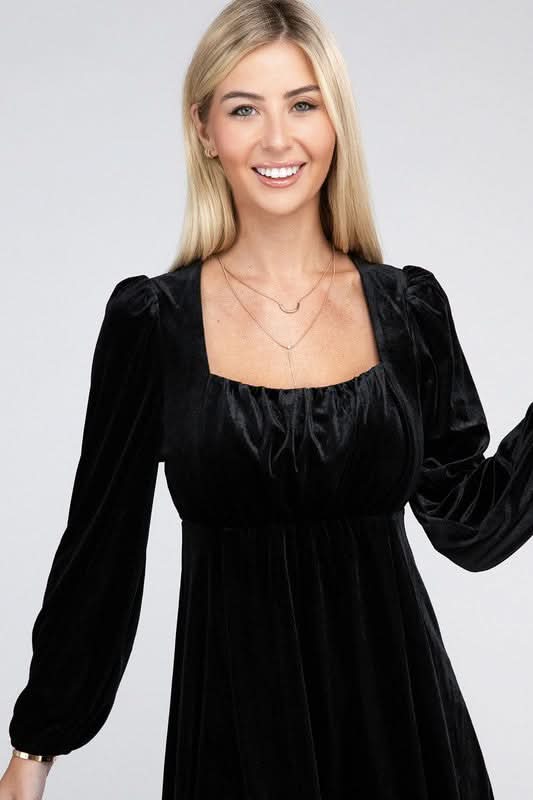 Add a touch of classic glamour with our Enchanted Evening Long Sleeve Black Velvet Mini Dress. This charming dress features a square neckline and a cinched high-waist design that gracefully transitions to a free-flowing skirt. The plush velvet material lends a luxurious feel, while the puff sleeves add a romantic flair, and the long sleeves provide a sleek silhouette, making it a timeless piece for those cooler evenings. Add a pair of delicate heels and a simple clutch to complete an enchanting and effortlessly chic look.
