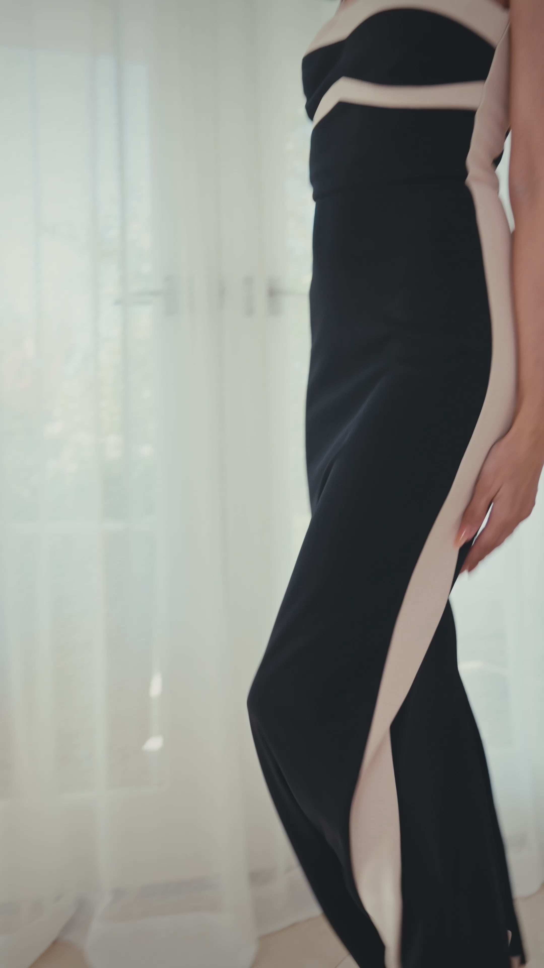 Walk in glamour in this fitted bodycon strapless maxi dress. Bling it out or keep it simple, it will be a moment. The strapless bodice features a rubber grip on inner seam to keep it secure and it has a modest back slit. The black with beige color block is an elegant touch.