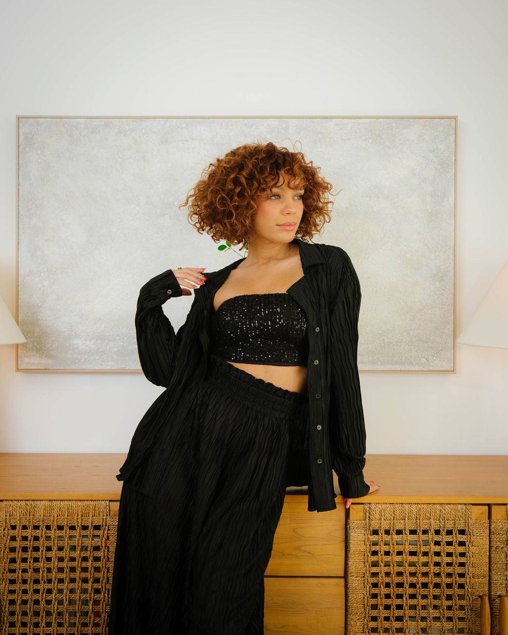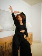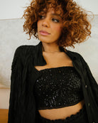 Our Midnight Poise Button Front Pleated Top blends classic grace and modern audacity. With its pleated design and long sleeves with buttoned cuffs, this woven blouse pairs perfectly with wide-leg pants and a sequin bra top for a sophisticated yet edgy look.