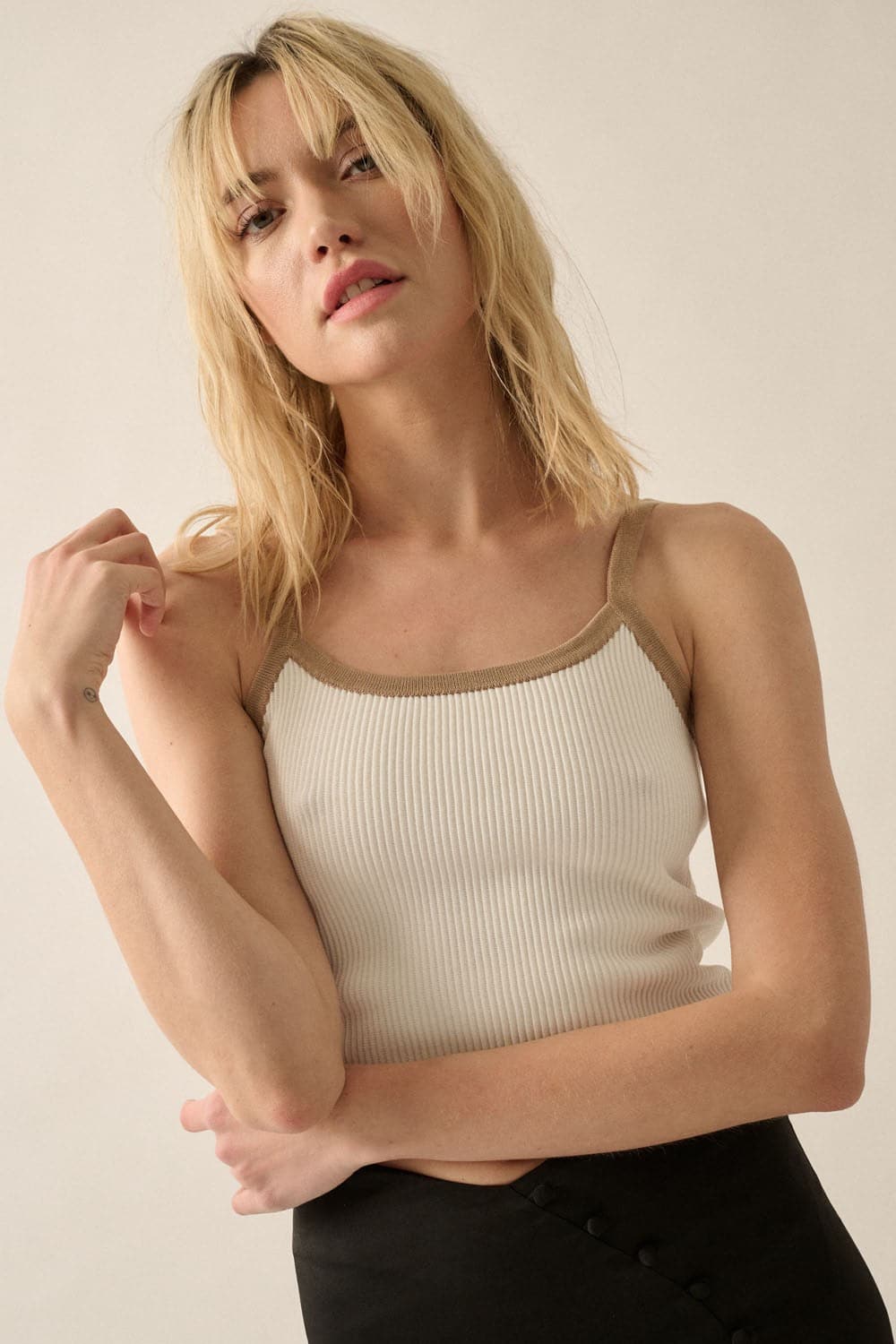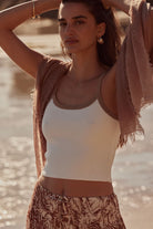 The Milan Minimalist Ribbed Tank Top is your new go-to for a sleek look. With a scoop neck and slim straps, this cropped tank fits relaxed yet refined. The contrasting trim adds a modern edge. It's made with stretchy fabric that shapes to your body, giving a contour that's flattering and comfortable. Whether you're dressing up or keeping it casual, this top's versatile style has got you covered.