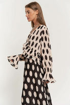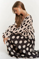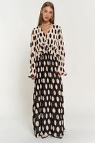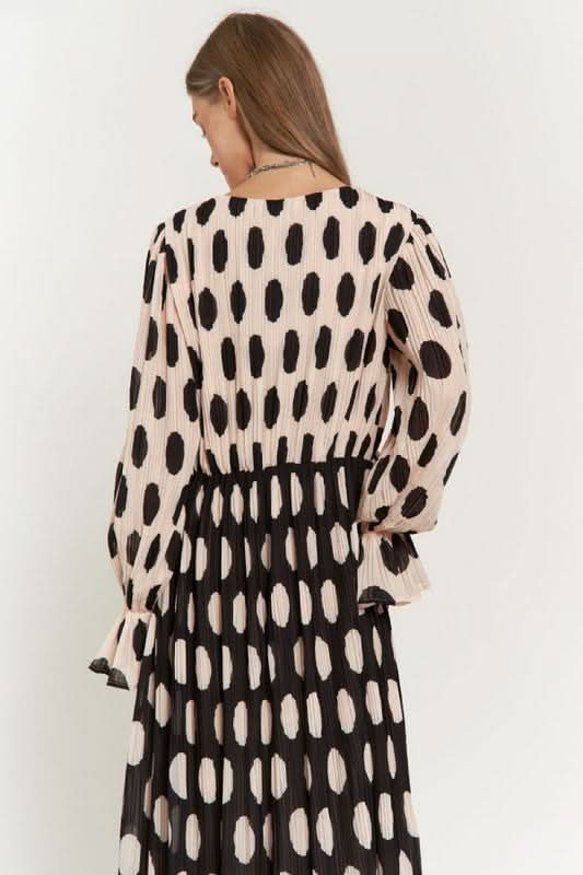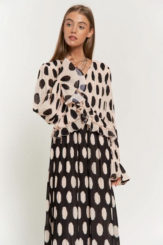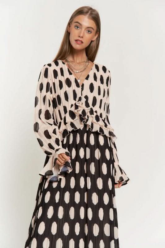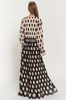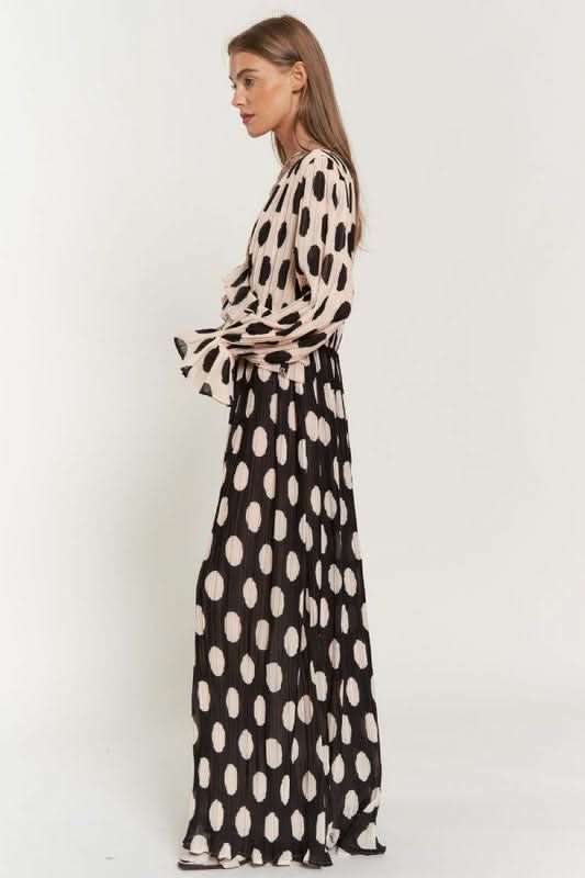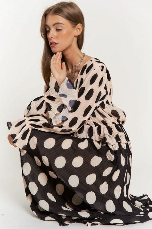 Dance through the day and into the night with our Retro Rendezvous Polka Dot Long Sleeve Maxi Dress. This dress is a whimsical tribute to the timeless polka dot, reimagined for the modern woman. The playful pattern is balanced with elegant ruffles and long sleeves, and the full pleated skirt cascades to create a fluid silhouette. This exquisite piece captures the essence of vintage charm and contemporary grace.
