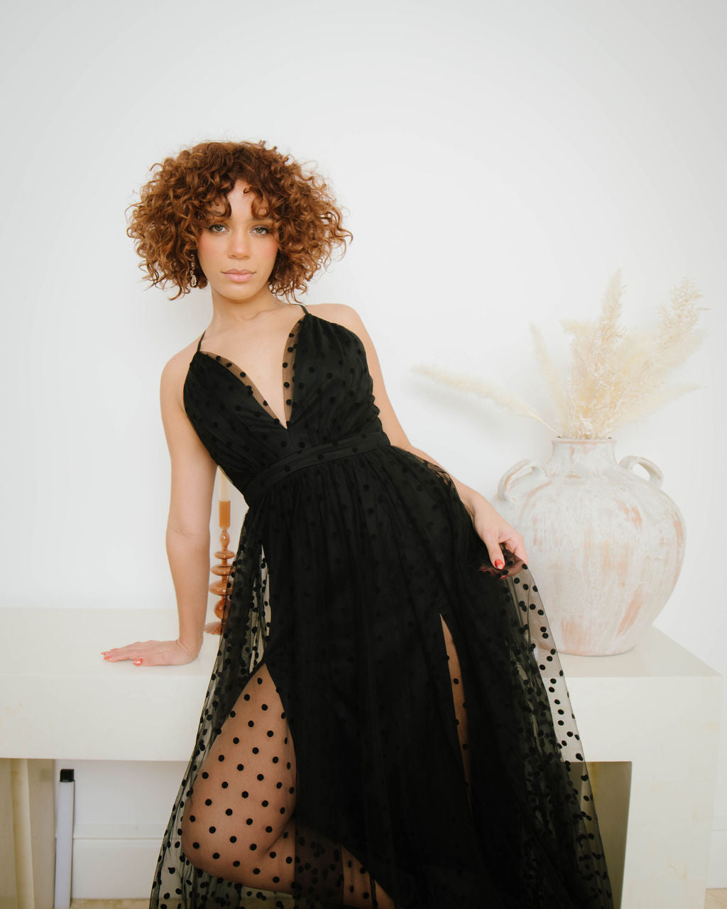 Step into the whimsical world of our Starry Night Black Maxi Dress With Mesh Overlay. This dress features a sultry open back, high side slits, and a mesh polka dot overlay that balances allure with elegance. It's the perfect cocktail, formal, or party dress.