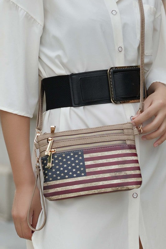 Celebrate effortless style and timeless Americana with this versatile crossbody wristlet. Crafted from soft vegan leather with a vintage-inspired flag print, it’s a true showstopper for casual days, festivals, or patriotic holidays. Designed for hands-free ease, the adjustable strap and detachable wristlet make it a must-have for women on the go. The bag’s multi-pocket functionality—including two front zip pockets and one back zip pocket—keeps essentials secure and organized. Gold-tone hardware accents add a touch of glam, while the interior slip pockets and zip pocket ensure your smaller essentials stay within reach.